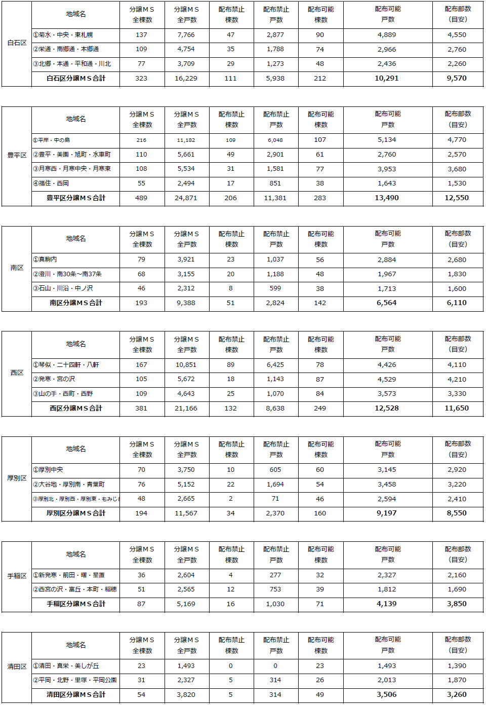 札幌市中央区、札幌市北区、札幌市東区、札幌市白石区、札幌市豊平区、札幌市南区、札幌市西区、札幌市厚別区、札幌市手稲区、札幌市清田区